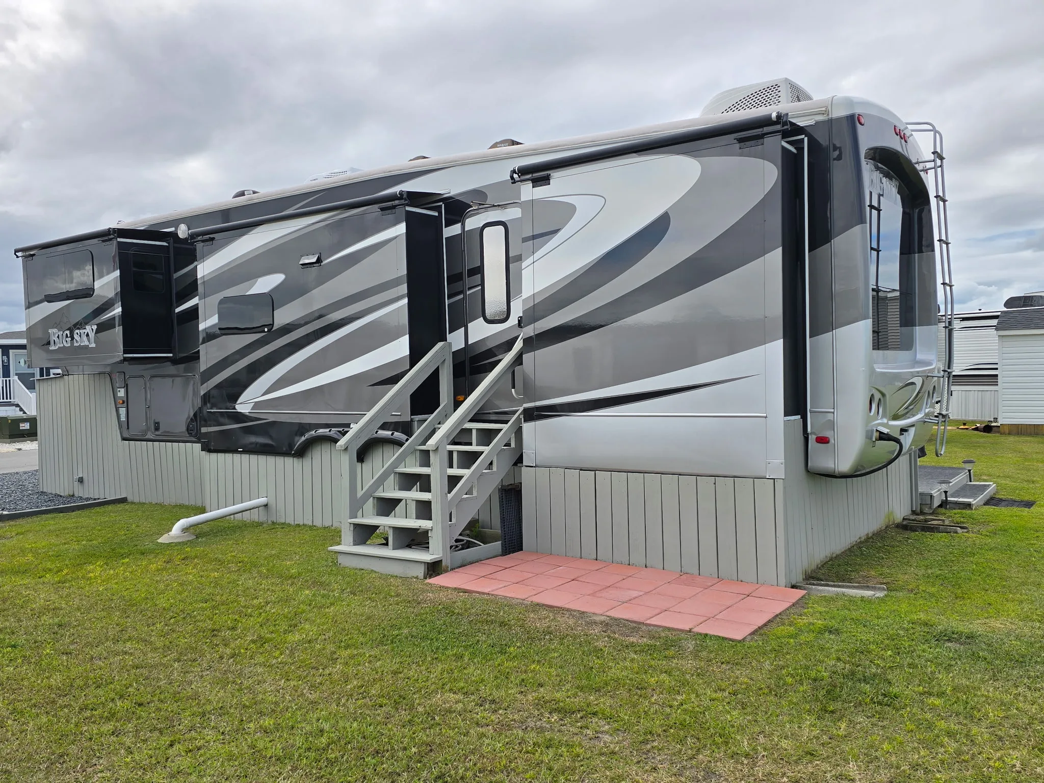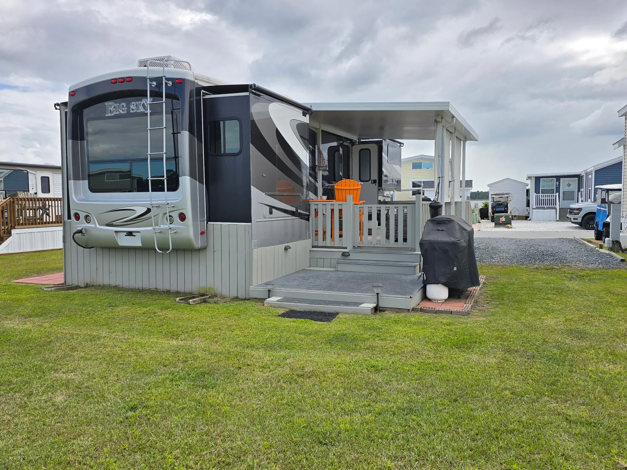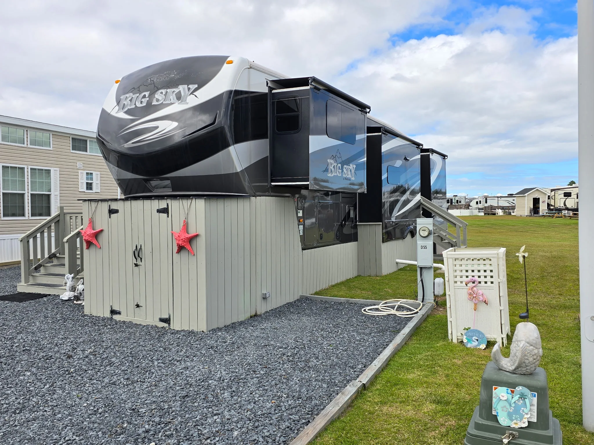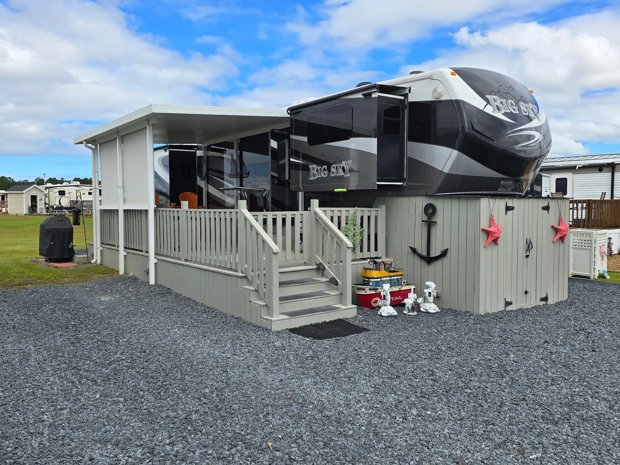 Montana 5th wheel that is full time living. Located at lot D-55 White Oak Shores Stella N.C. Will include furniture linens & kitchen dishes & utensils. Lot rent paid to April 2026.