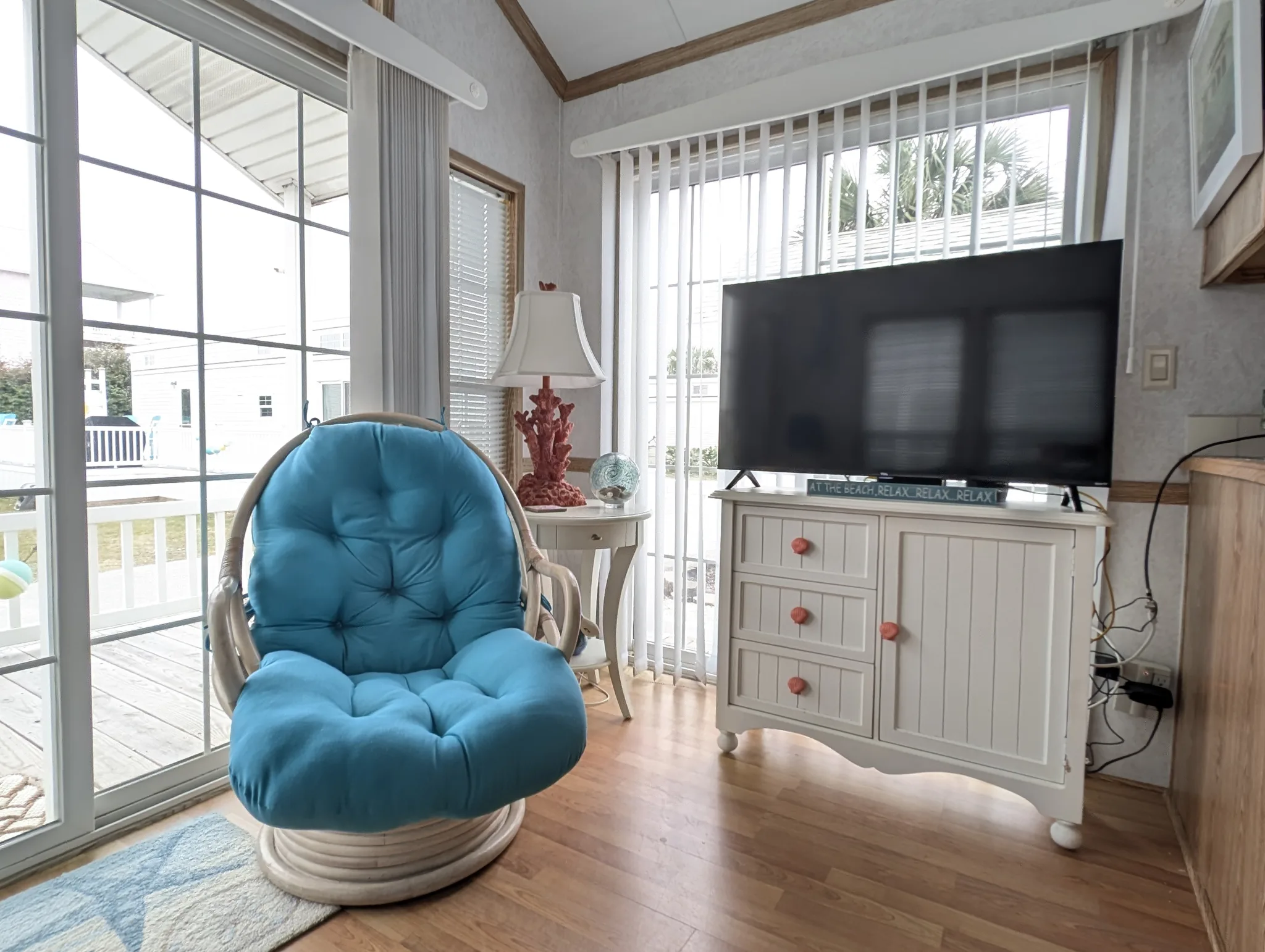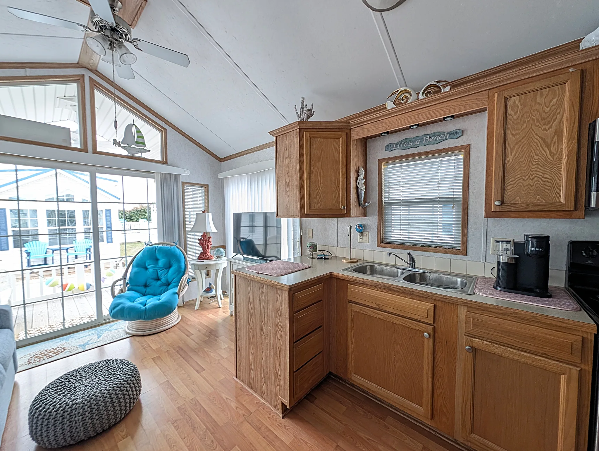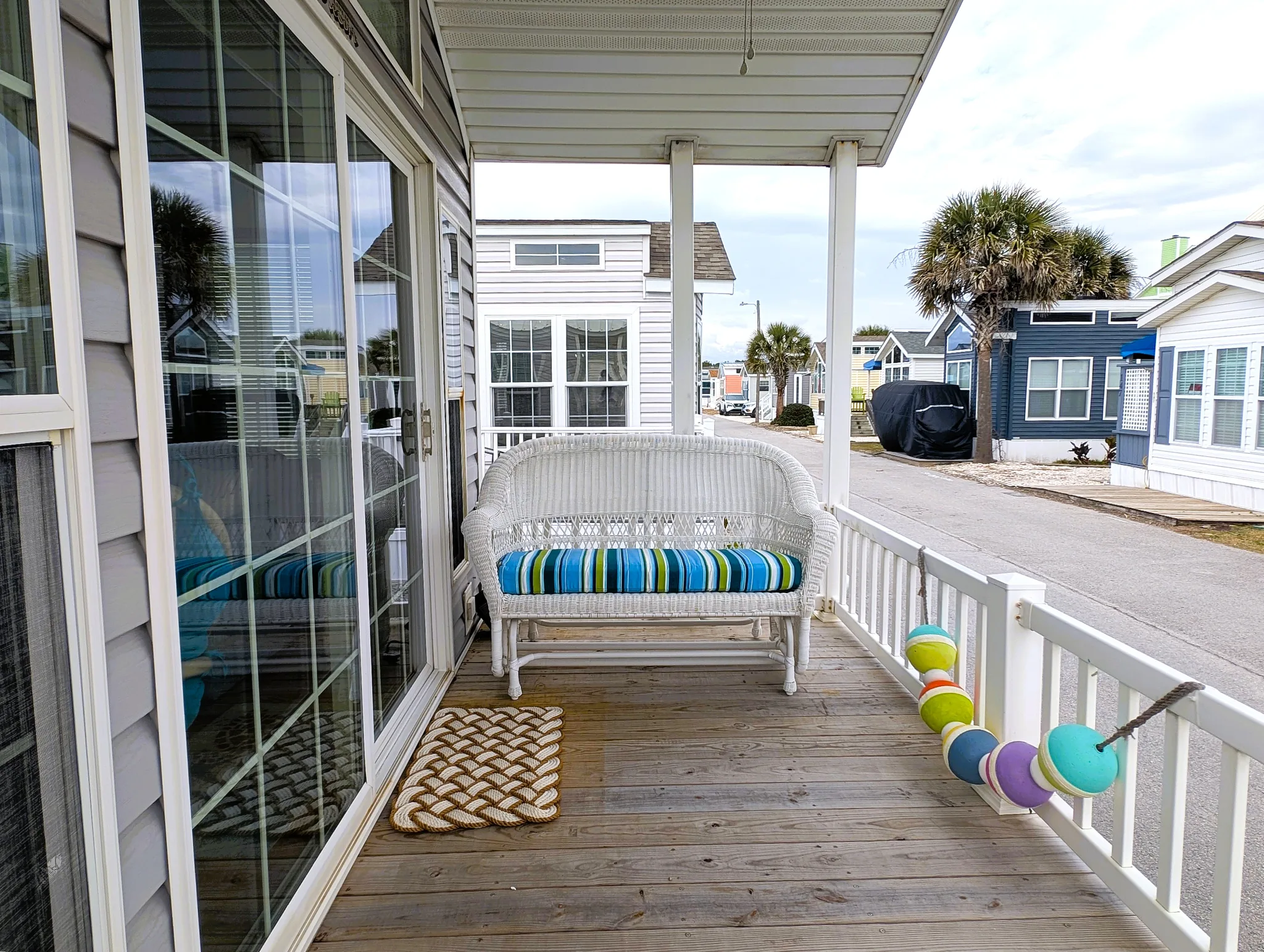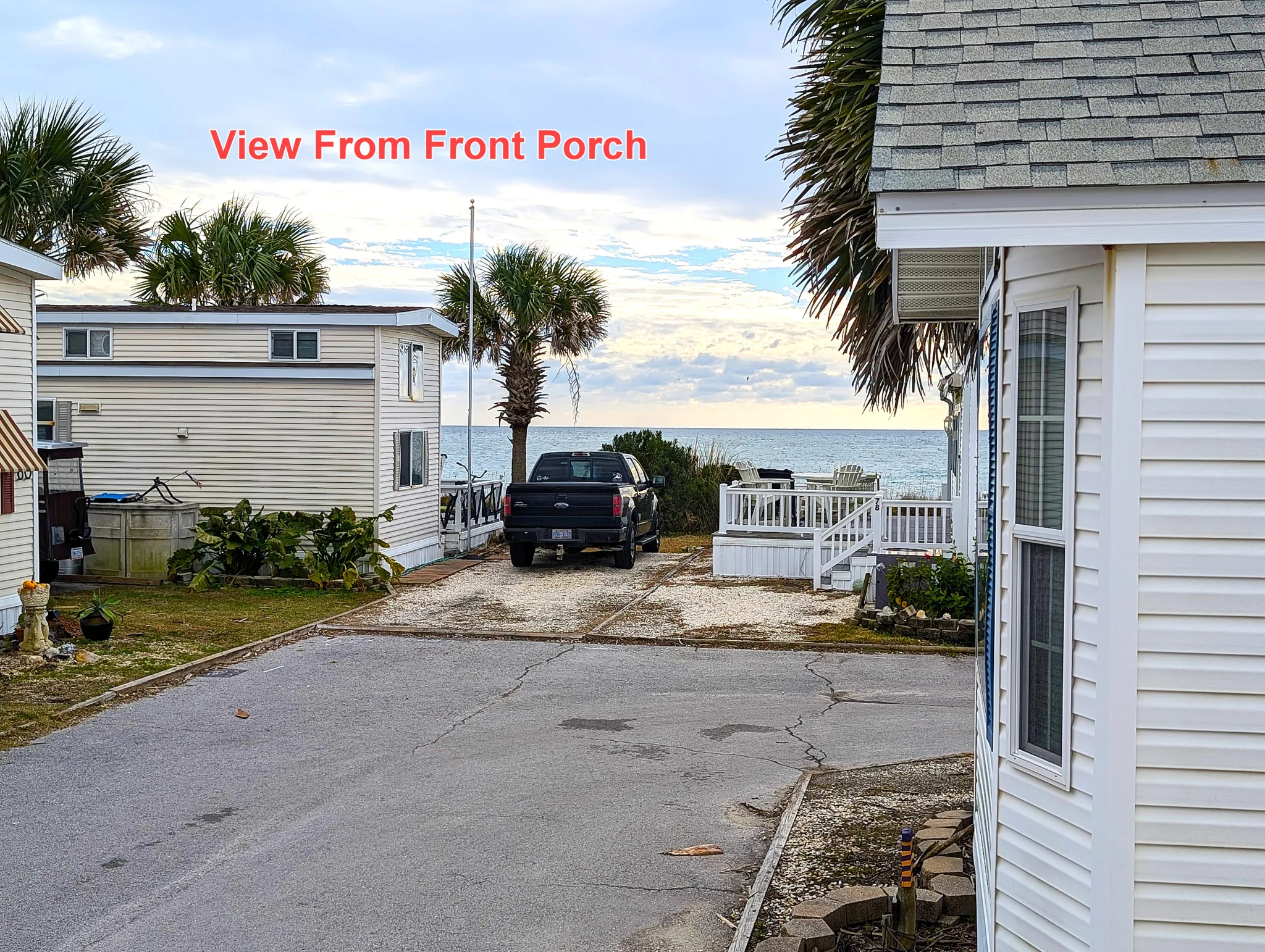 The outside of this unit features a fabulous covered front porch where you can sip your coffee in the morning while you listen to the waves, stare at the ocean and contemplate the mysteries of the universe. At night, take in the sunset while you grill and entertain friends on the deck of this idyllic seaside utopia. Perfect for entertaining, the rear portion of the deck has comfortable seating for four around the table and has ample room if you want to add a firepit or grill. Includes durable PVC deck rails that never have to be painted and don’t rust. PVC privacy panels afford privacy and buffer the wind when grilling or using a firepit. The metal roof was inspected in 2023 and sealant added where needed. For convenience, there is a rear entry door in addition to the patio door leading to the deck and the other patio door leading to the covered front porch. A storage unit in the driveway and access door built into the skirting gives you storage under the unit.