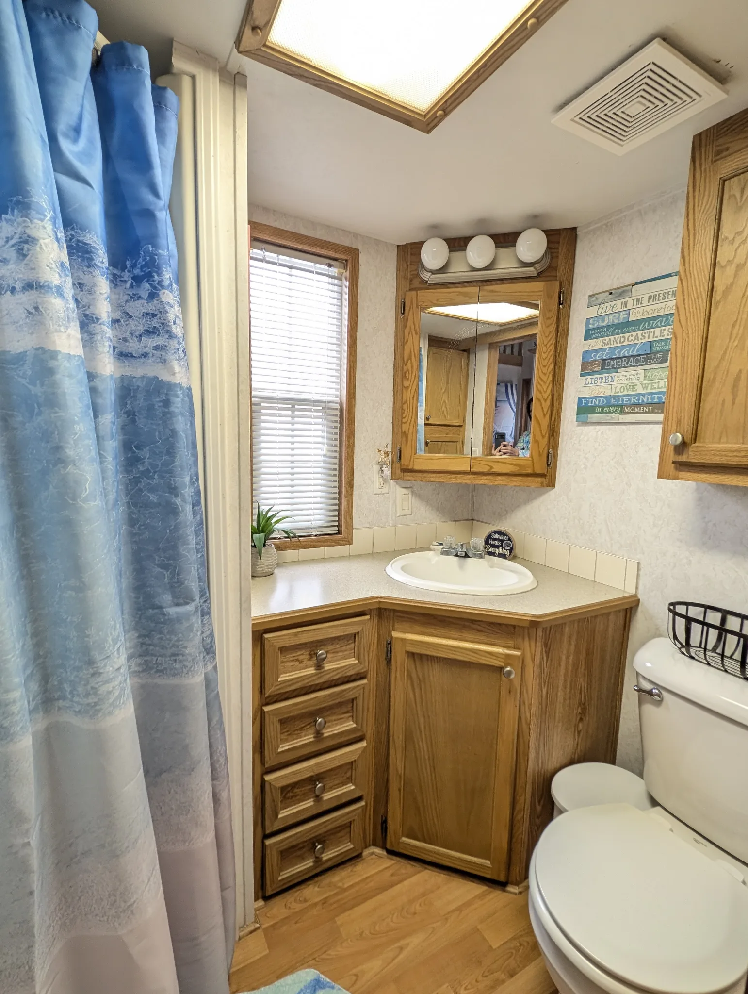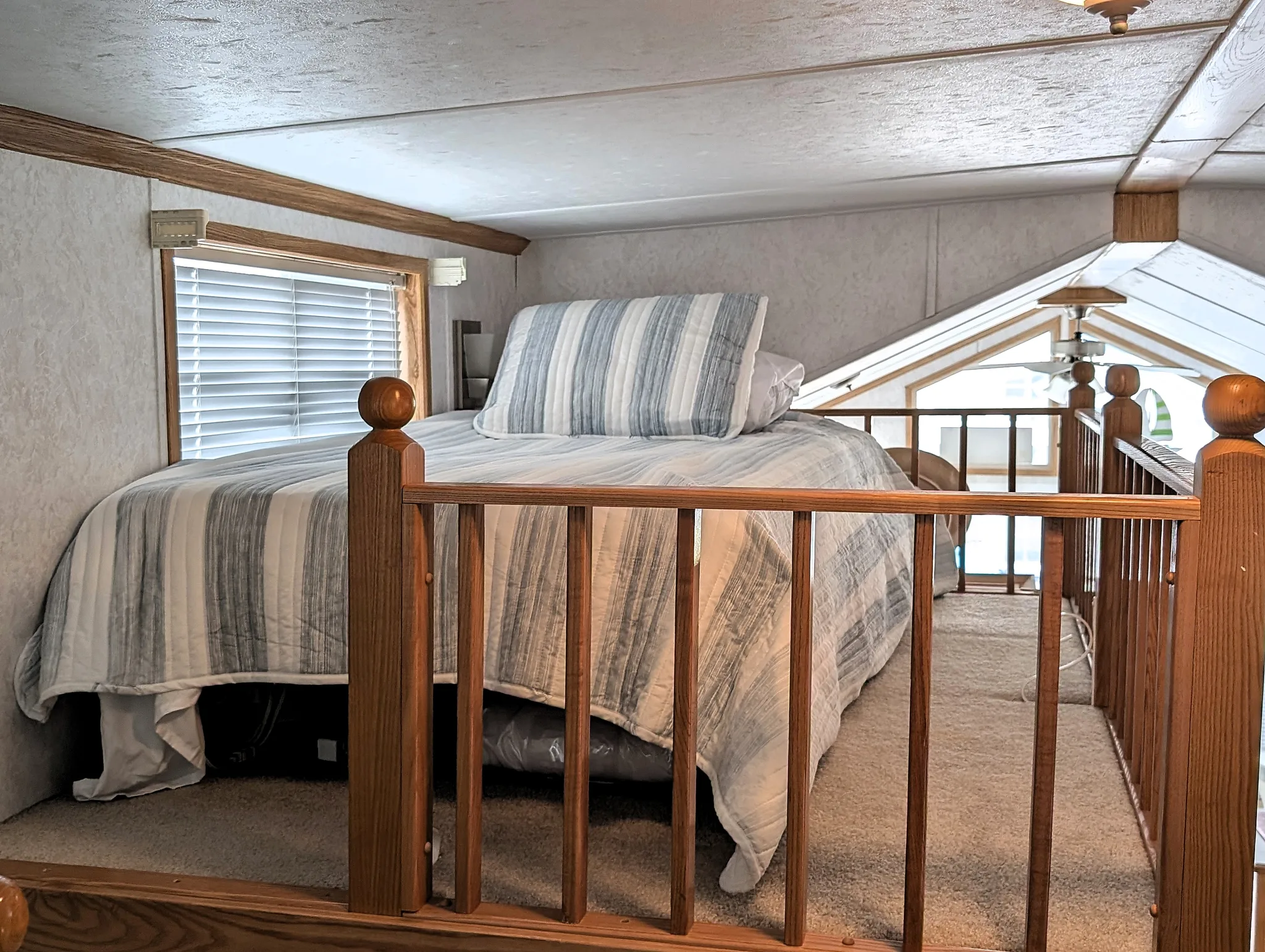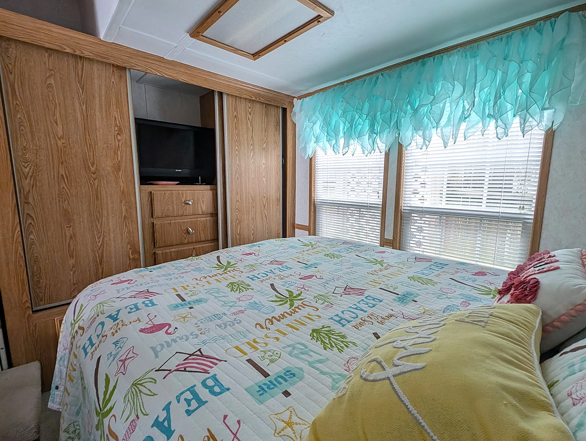 The master bedroom is at the rear of the unit and comfortably fits a queen size mattress. In addition to the cabinets above the bed, there is plenty of storage space under the bed as well. Opposite the bed is a closet system that takes up the entire wall and has two sliding doors to hang long items and built-in drawers underneath and between the sliding doors. Complete with dual night stands, wall sconces besides the bed and a TV for your enjoyment. Outside the master bedroom is a door leading to the deck.