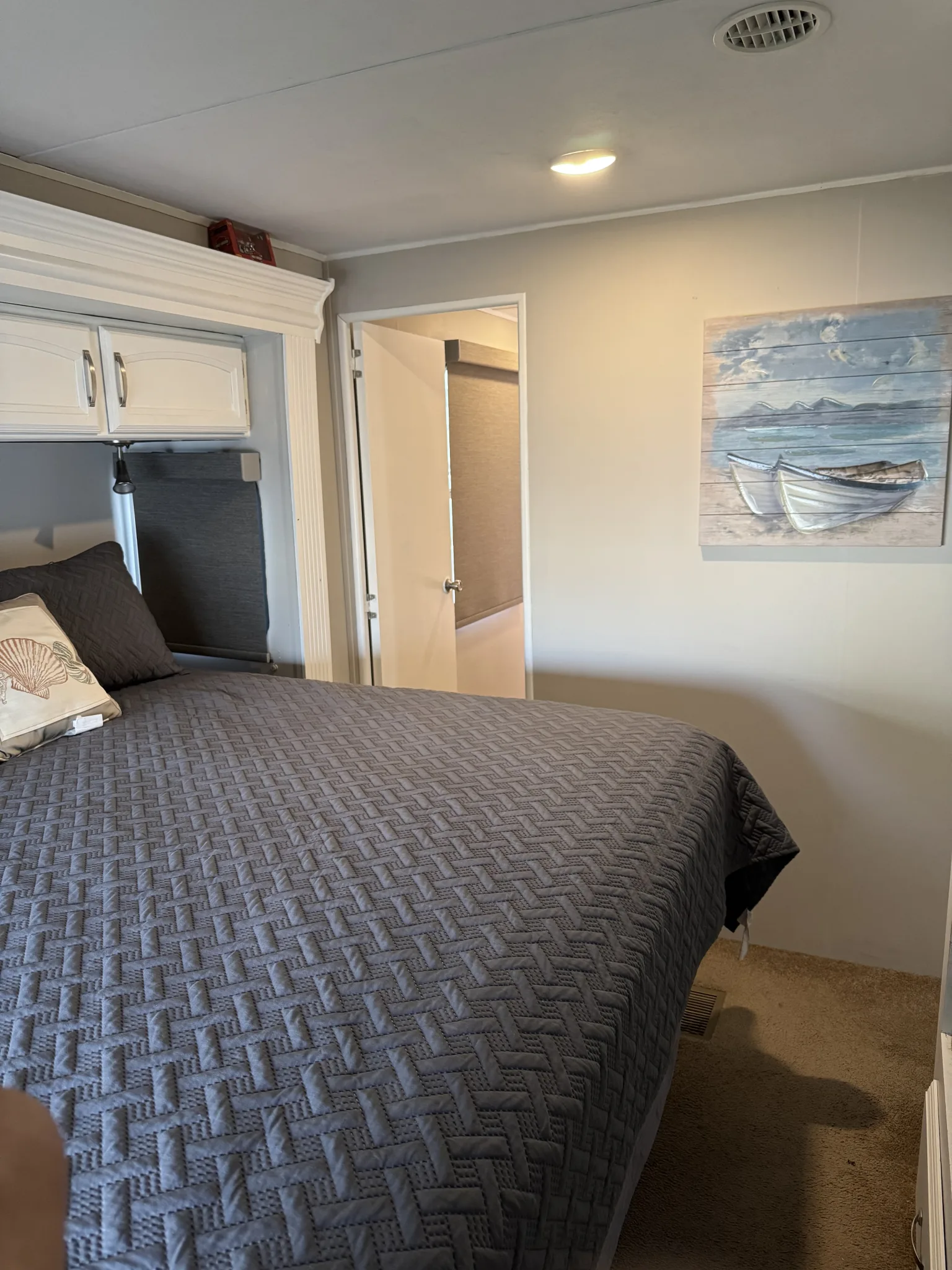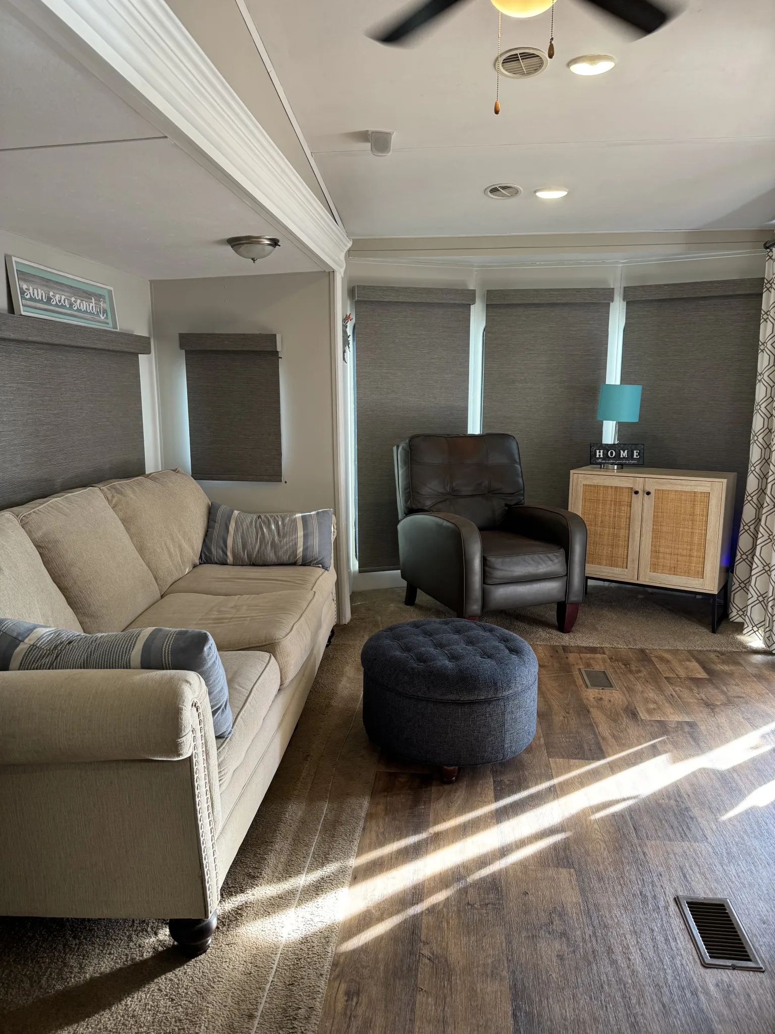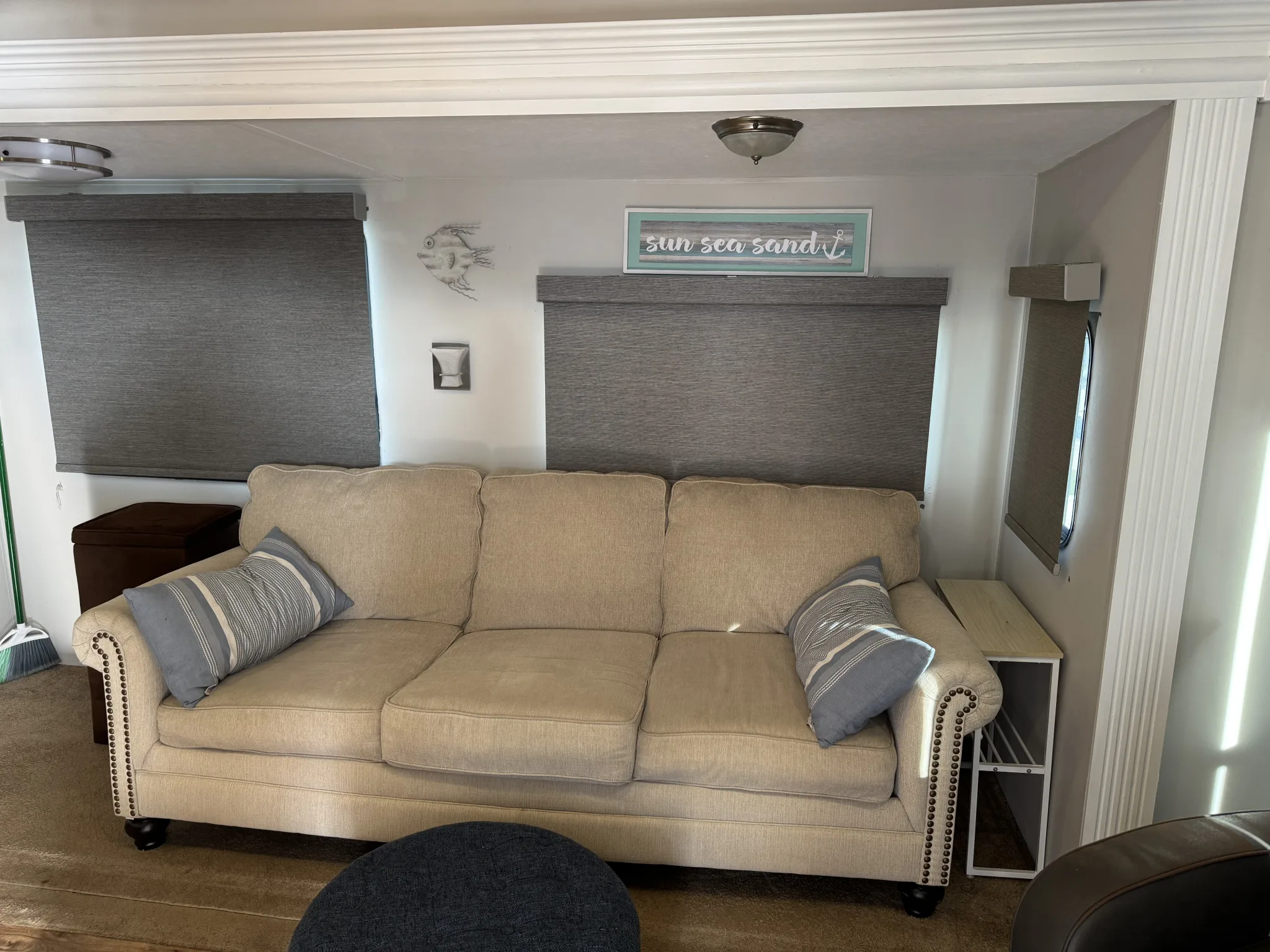 - Queen sleeper sofa, grey recliner, new TV in living room