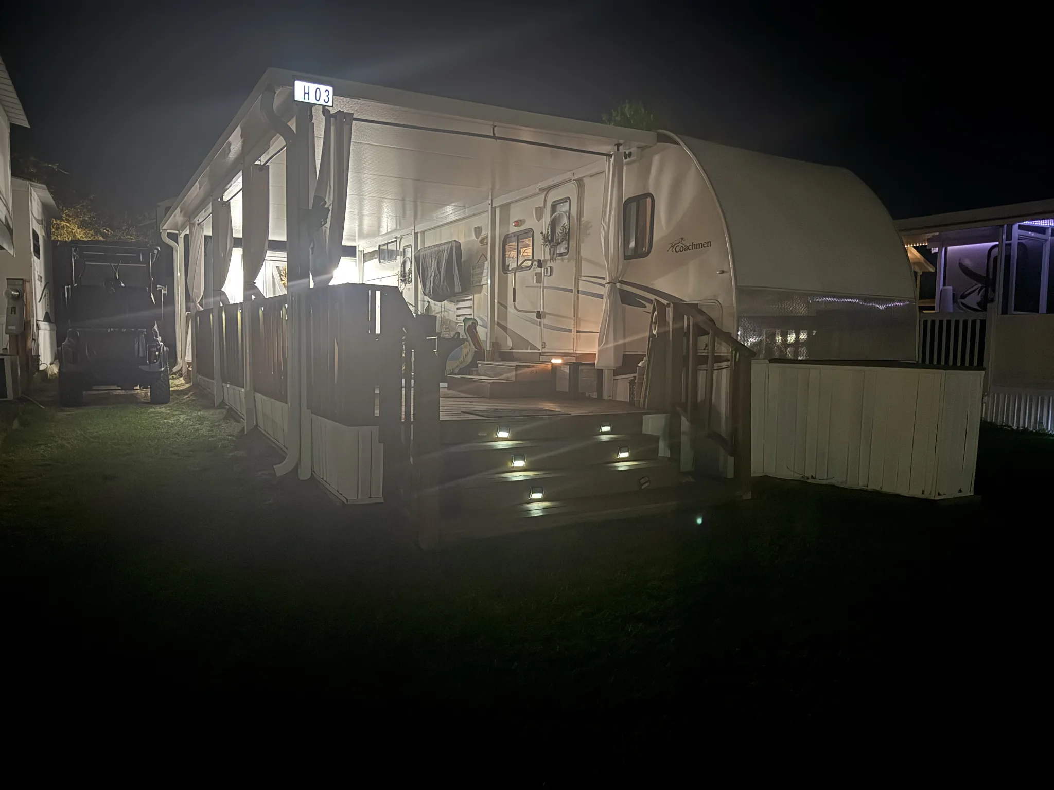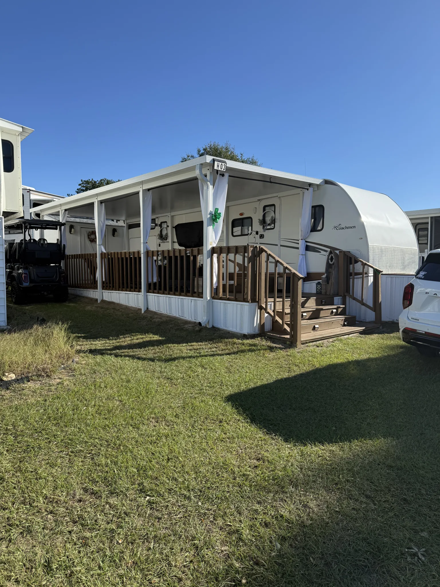 •10×30 deck (replaced last year) with hard top awning and awnings over slide outs