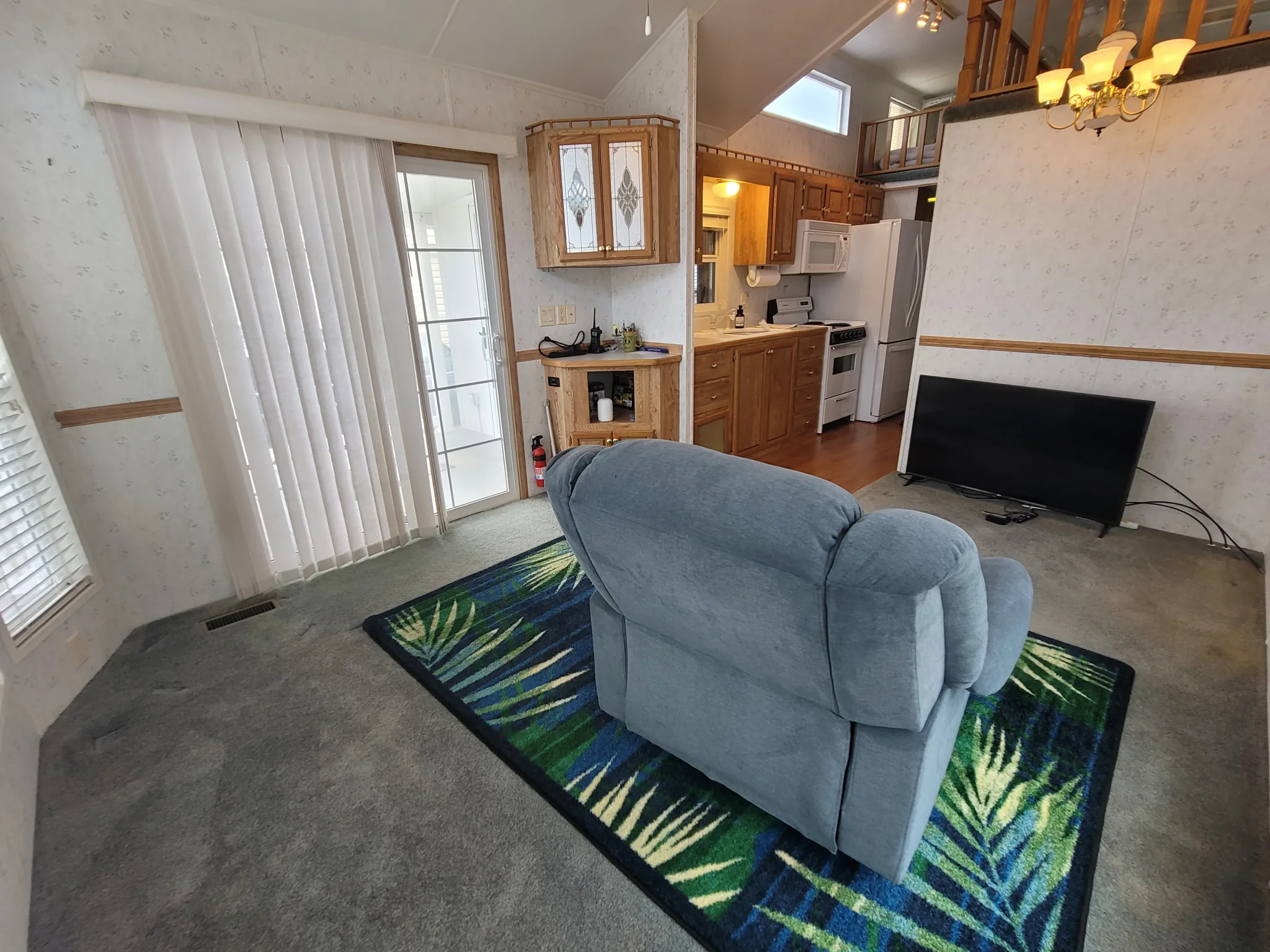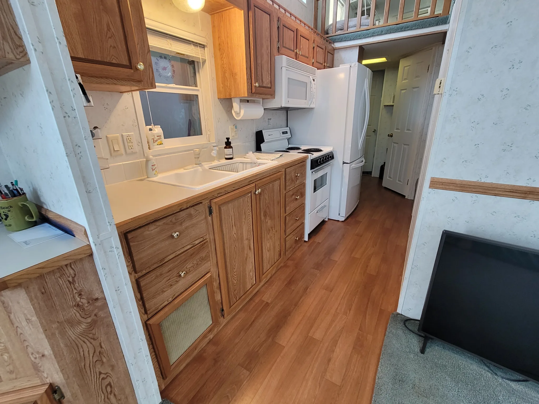 – kitchen appliances – electric range, full size fridge/freezer, and microwave