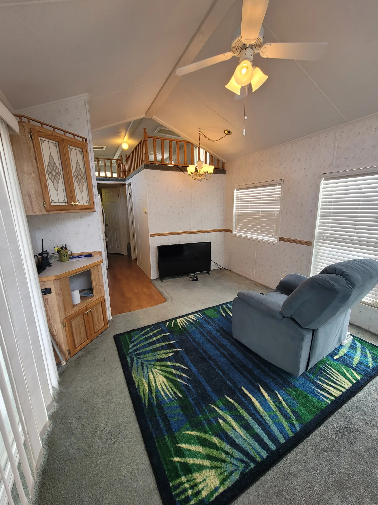 Master bedroom is a queen, bed and mattress included. The loft has a full mattress set in bedroom, and twin mattress. Could also fit full mattress in loft sleeping area, and sleeper soda in living room to sleep 8 comfortably. Main camper is 35′ x 11′, and enclosed 17′ x 8′ porch room with electric, LVP flooring, for entertaining, extra sleeping area, or storage, and personal laundry.