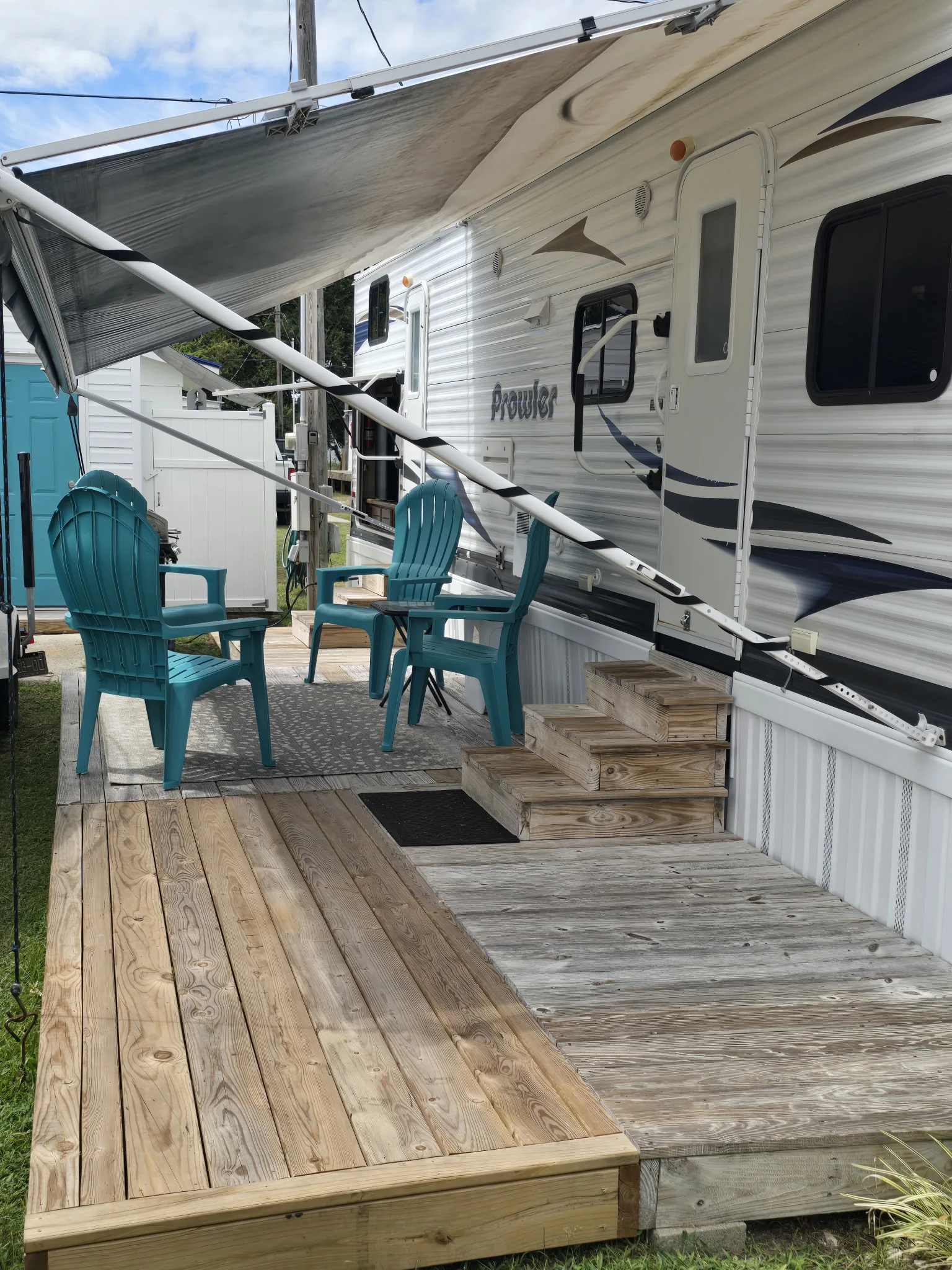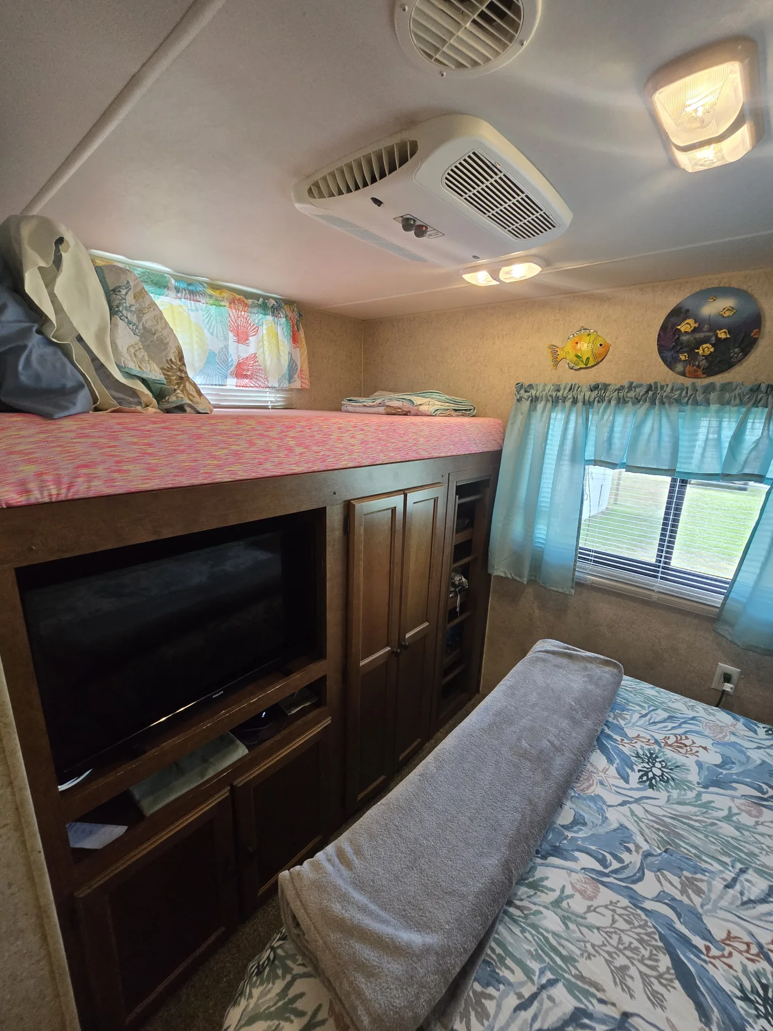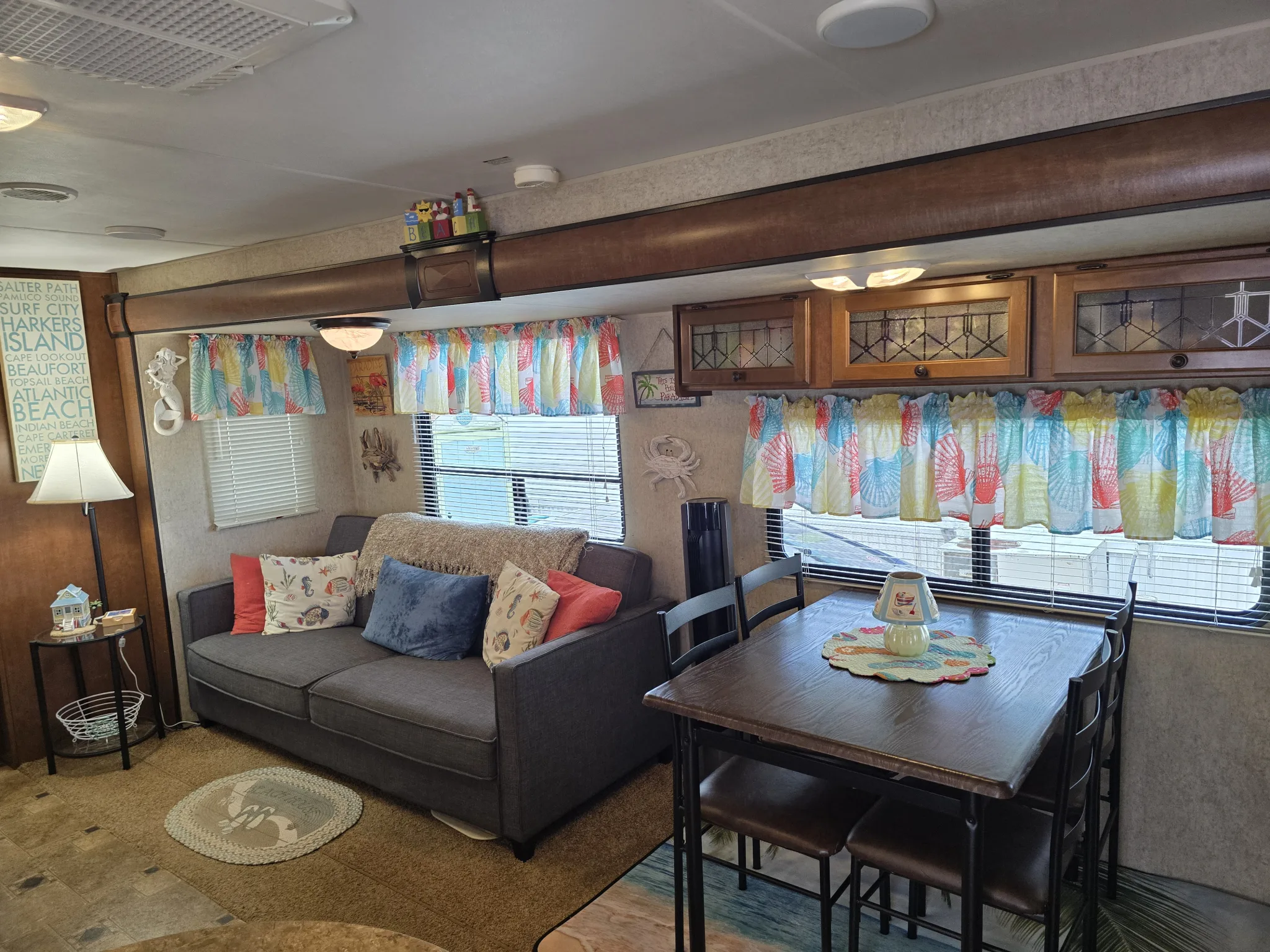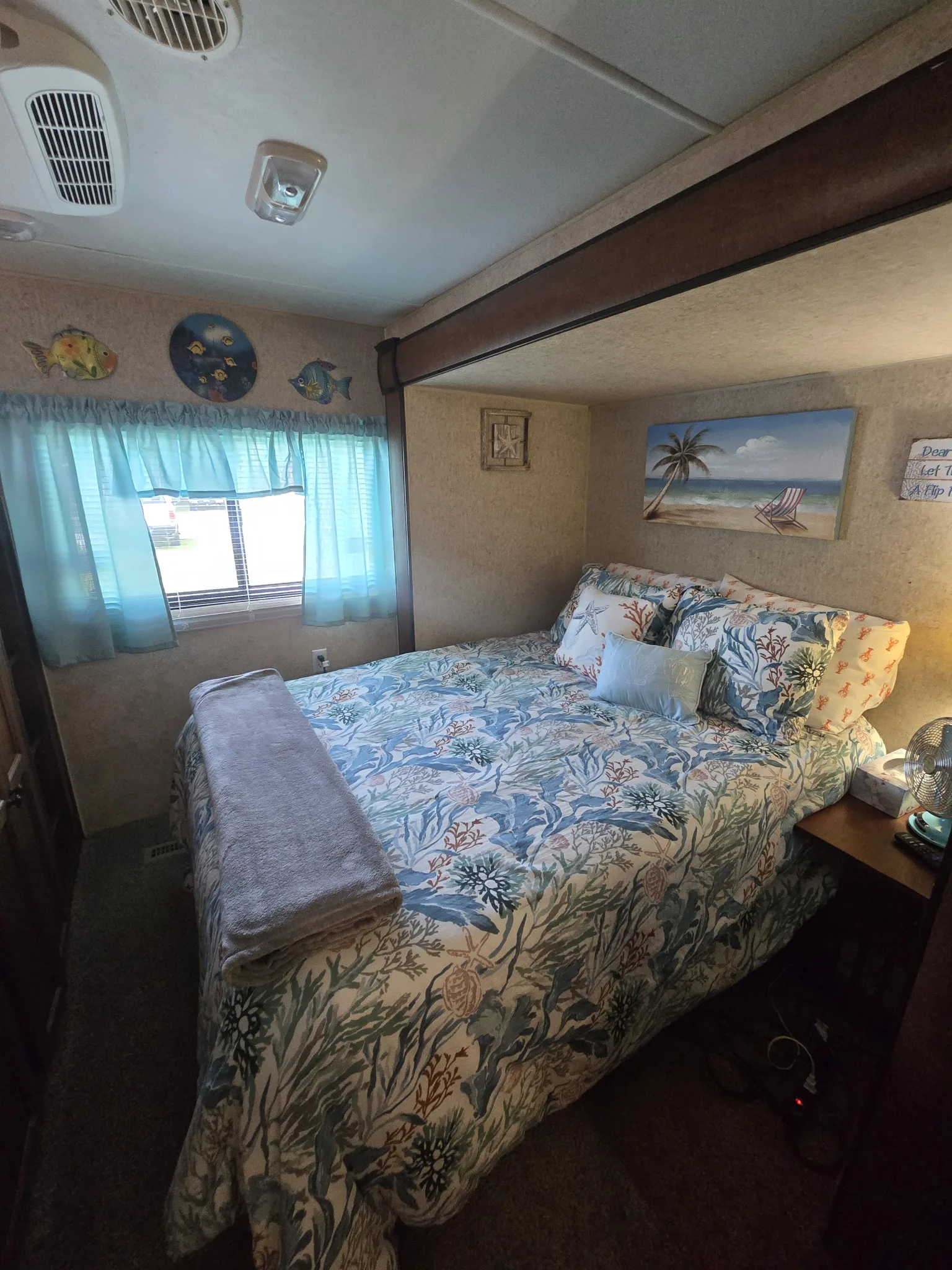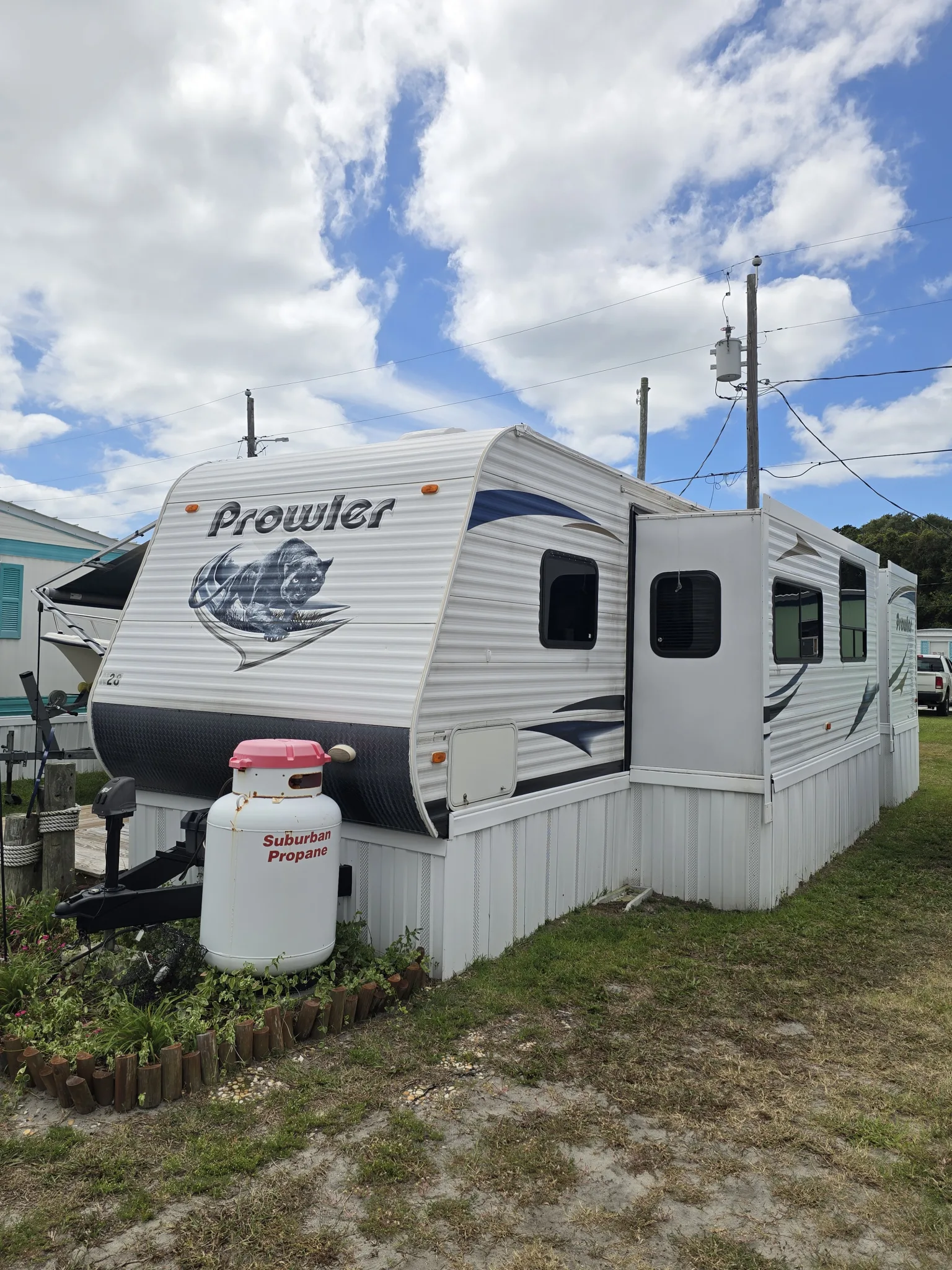 Well cared for 2012 32 ft Prowler camper on rented lot N28 in Oceanfront Court Salter Path. Spacious 2 bedroom with front queen, rear full and bunk. Couch also makes a bed. Sleeps 7. Many upgrades in the past few years. Dual air conditioners. Rear ac replaced last year. Refrigerator replaced with larger one last year. Has house toilet and vanity in bathroom. House furniture throughout. Fireplace and TV in living room are new. Barn and outdoor shower built summer of 2022. Deck built within past few years. Awning summer of 2021. Has built in stereo with indoor and outdoor speakers and Bluetooth. Stove oven and microwave. Comes fully furnished with some items. Lot rent currently 6650.00 paid up through June 01, 2026. Rent includes water, sewer and trash. Park has private ocean access, private pier and boat ramp on Sound side. One of the only parks on the island with Ocean and Sound access from within the park. ***No dogs or golf carts allowed*** Buyer must be approved by park. Motivated seller.