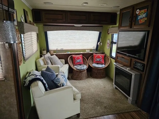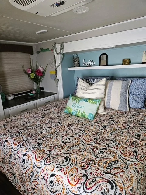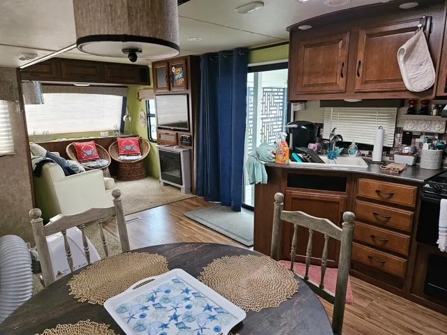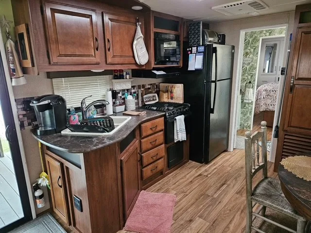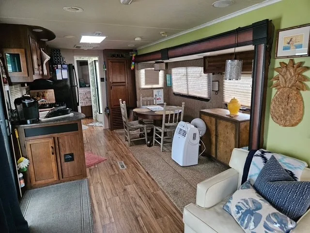 All set up and ready to enjoy! Comes fully furnished (w/ full size refrigerator) and decorated!  Includes a covered deck and storage shed. Lot rent is paid up through March 31, 2026.  Clear title in hand.  This Travel Trailer is perfect for couples but can sleep up to six.  You cannot beat the location; just three lots from the sound!  Visit the Goose Creek RV Park website.  It has a ton of activities for kids and adults!